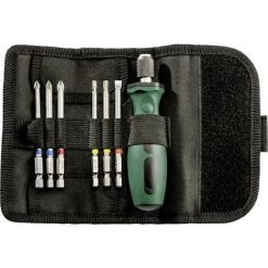 - 1 x poignée de tournevis, 1 x PH 2, 1 x PZ 1, 1 x PZ 2, 1 x T 20, 1 x SL 5,5, 1 x étui à enrouler.